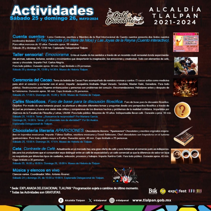 El programa incluye ceremonias de cacao, catas de café, emociorama, cafés filosóficos, chocolaterías literarias, cuenta cuentos para niños y música en vivo. “Es el mejor evento en su tipo en la Ciudad de México, diseñado para que lo disfrute toda la familia. El Centro Histórico de Tlalpan es un lugar ideal para pasear, este año esperamos cerca de entre 10 mil y 12 mil personas, la mayoría asisten entre sábado y domingo”, aseguró Romero quien añadió que además de esta feria también organizan la Feria del Mundo a mediados del mes de julio en Coyoacán, un festival gastronómico y artesanal con más de 40 naciones representada por gente nativa de esos países, también hay artesanía, danza y música. El propósito es que la gente de la Ciudad de México pueda conocer costumbres y tradiciones de otros países sin salir de México.