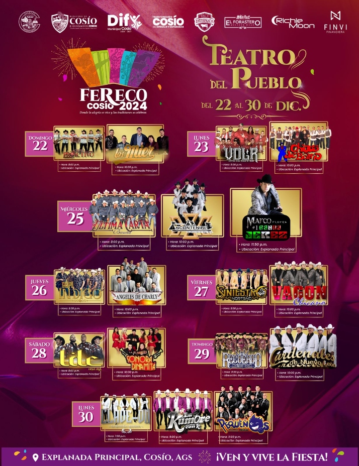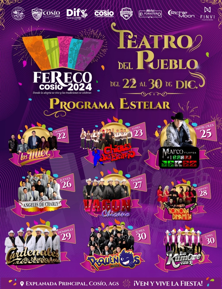 Este año, la lista de espectáculos incluye a Los Chicos del Barrio, Marco Flores y la Número 1 Banda Jerez, Los Ángeles de Charly, Vagón Chicano, La Rumbera Sonora Dinamita, Cardenales de Nuevo León y Banda Pequeños Musical. Además, los diferentes escenarios, como el Foro 45 Norte y el propio Teatro del Pueblo, ofrecerán presentaciones culturales como danzas folclóricas, ballet urbano y espectáculos locales que destacarán el talento regional.