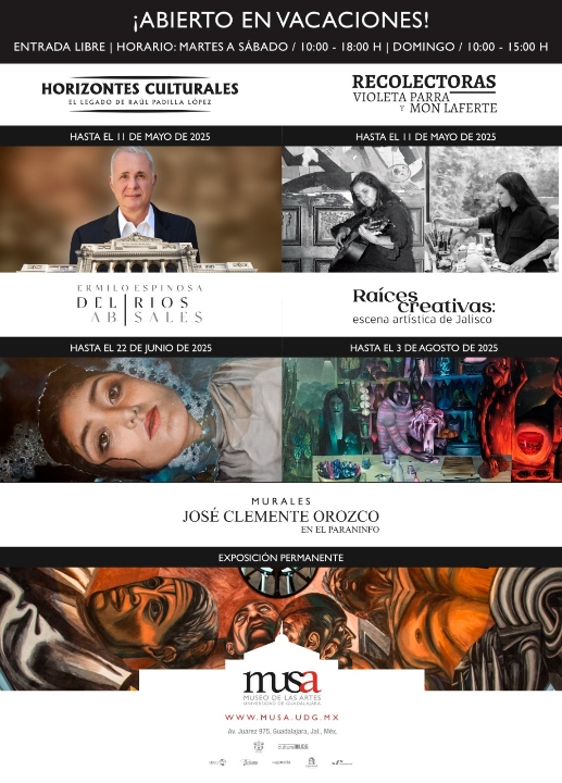 El MUSA recibe a los visitantes en vacaciones con cuatro exposiciones Guadalajara, México (11 de abril de 2025). El MUSA Museo de las Artes de la Universidad de Guadalajara estará abierto en su horario habitual durante el periodo vacacional de primavera para que todos los visitantes puedan conocer las cuatro exposiciones con las que cuenta, así como disfrutar de los murales de José Clemente Orozco en el Paraninfo “Enrique Díaz de León”. El público podrá entrar al recinto, de manera gratuita, de martes a sábado de 10:00 a 18:00 horas y domingo de 10:00 a 15:00 horas.