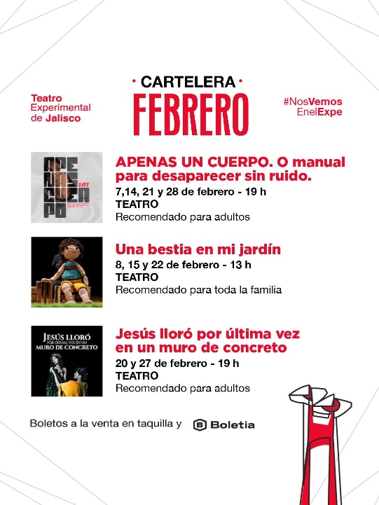 Jesús lloró por última vez en un muro de concreto, escrita y dirigida por Cristian Bravo, Apenas un cuerpo o manual para desaparecer sin ruido, el unipersonal escrito y dirigido por René González e interpretado por Alberto Magaña, así como la obra para público infantil Una bestia en mi jardín son los montajes que pueden apreciarse en febrero en el Teatro Experimental de Jalisco durante febrero.