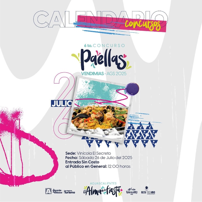 La convocatoria para la edición 6 del Concurso de Paellas que se realizará en el Marco de las Vendimias 2025 de la Ruta del Vino de Aguascalientes ya está abierta.