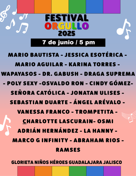 «La Marcha del Orgullo LGBTQ+ Guadalajara 2025 se realiza hoy sábado 7 desde las 14:00 horas partiendo de La Minerva y culminará con el Festival Orgullo gratuito para todas las personas en la Glorieta de Niños Héroes.