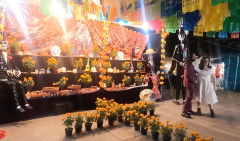 One of this year’s unique features is that today you can see two spaces that are a kind of themed set with altars and other stage elements related to the Day of the Dead and Halloween, where visitors stop to take photos.