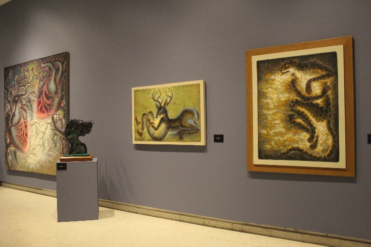 Flores añadió que a lo largo de su trayectoria ha pintado mucho sobre papel amate, óleo sobre tela, y que en la muestra hay también piezas en bronce a la cera perdida, talla en madera y talla en esqueleto de calamar.
