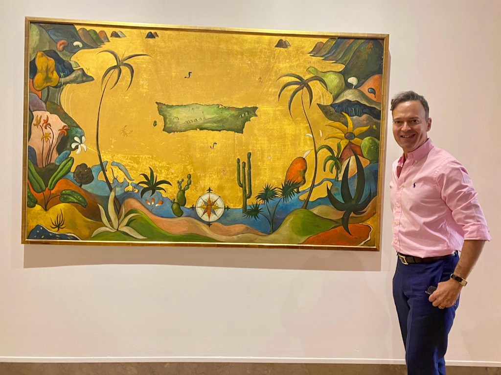Israel Rolón Barada junto a una de las obras de arte más emblemáticas del periódico EL MUNDO que gracias a Tina Hills y la Fundación AR pertenece ahora al Museo de Arte de Puerto Rico. Ana Barada luciendo un broche obsequio /reconocimiento de Tina Hills/Israel Rolón Barada next to one of the most iconic works of art from the newspaper EL MUNDO, which, thanks to Tina Hills and the AR Foundation, now belongs to the Puerto Rico Museum of Art. Ana Barada wearing a pin, a gift/recognition from Tina Hills. Fotos: IRB